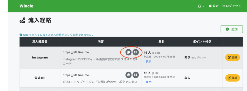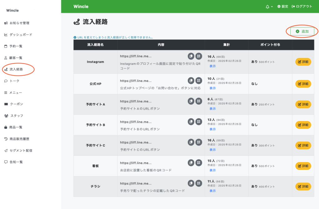 Wincle管理画面のサイドバーから、流入経路を選択し、追加をクリック