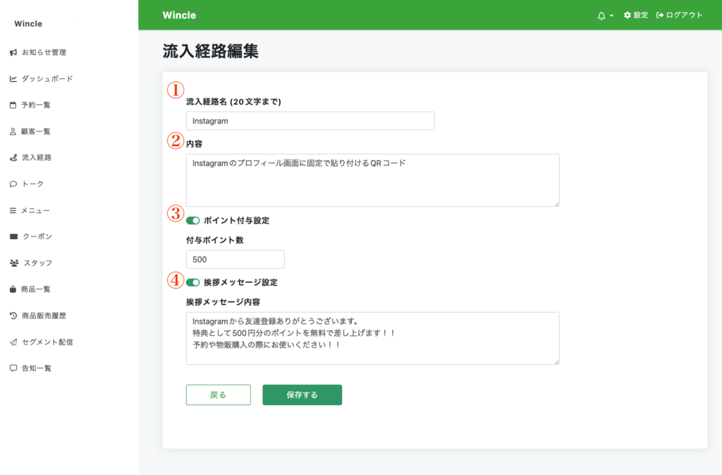 ③ポイント付与設定:オンにすると、友達登録時に流入経路ごとに設定したポイントを付与します。